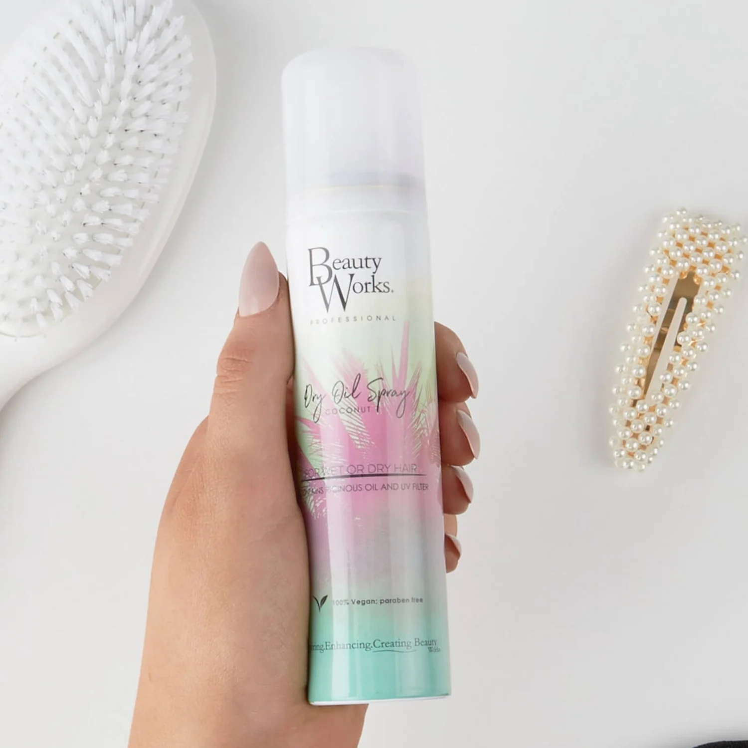 Enhance lacklustre tresses with instant shine using the Beauty Works Dry Oil Spray. This hair treatment is designed to replenish the look of your locks and tame unruly frizz, promoting a silky, high-gloss finish.
