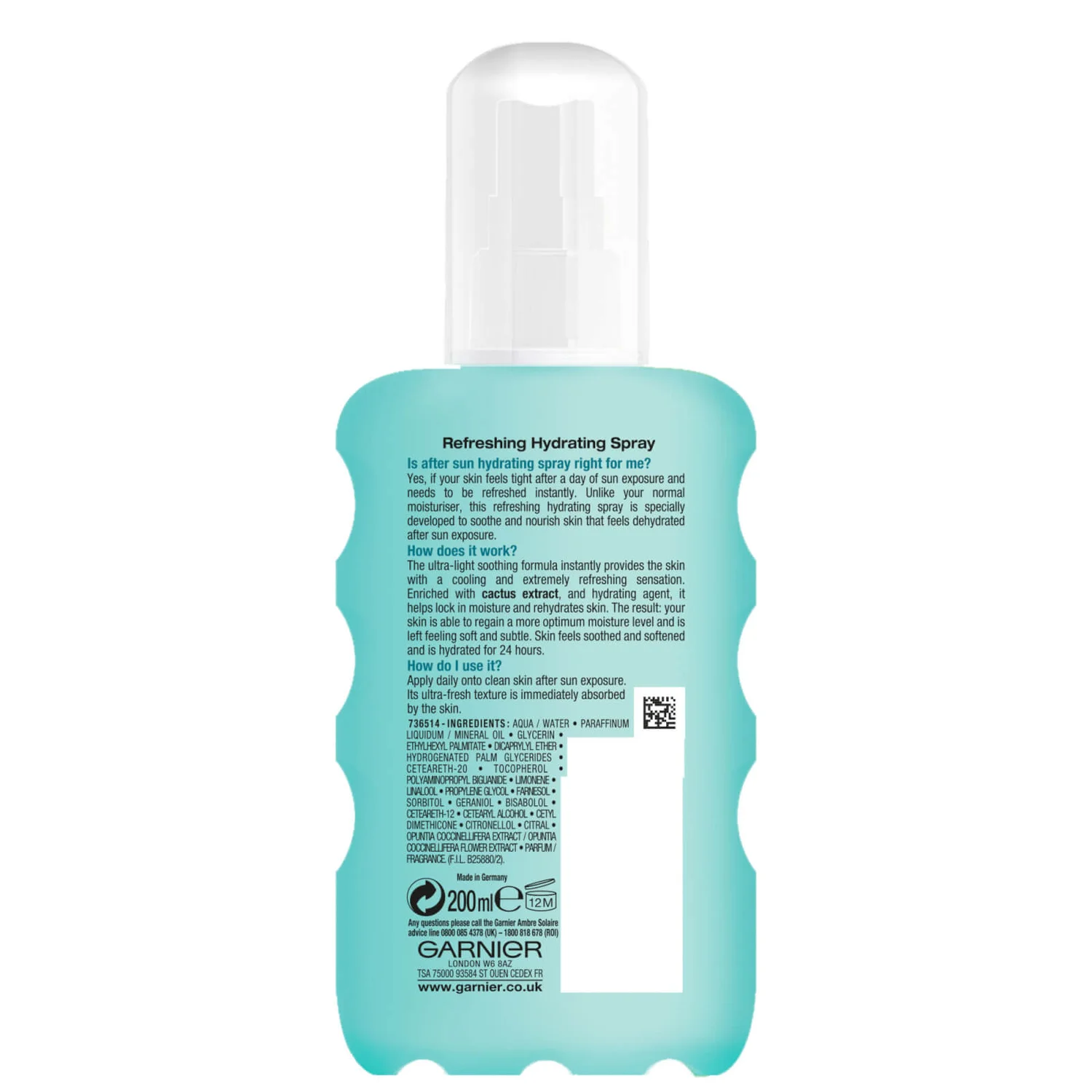 Soothe skin after sun exposure with Garnier Ambre Solaire Aftersun Spray 200ml. Providing intense hydration, it moisturises skin that has been dried out by the sun’s rays. Enriched with moisturising cactus extract, it soothes and nourishes your skin, leaving it refreshed and full of vitality.