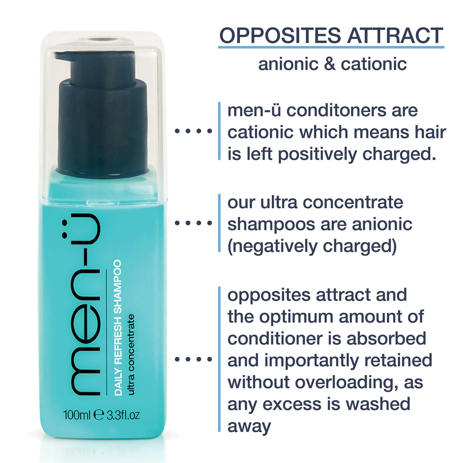 Conditioning the hair without overloading, the nourishing formula helps to smoothen hair’s texture while improving natural shine. Unlike men-ü shampoos, which are anionic (negatively charged), this conditioner is cationic, which means it is positively charged. As opposites attract, this means the optimum amount of conditioner is absorbed and retained without overloading. Any excess is washed away. men-ü shampoos and conditioners are a very powerful combination to recharge the hair. Expect silky-soft, recharged hair with improved resilience.