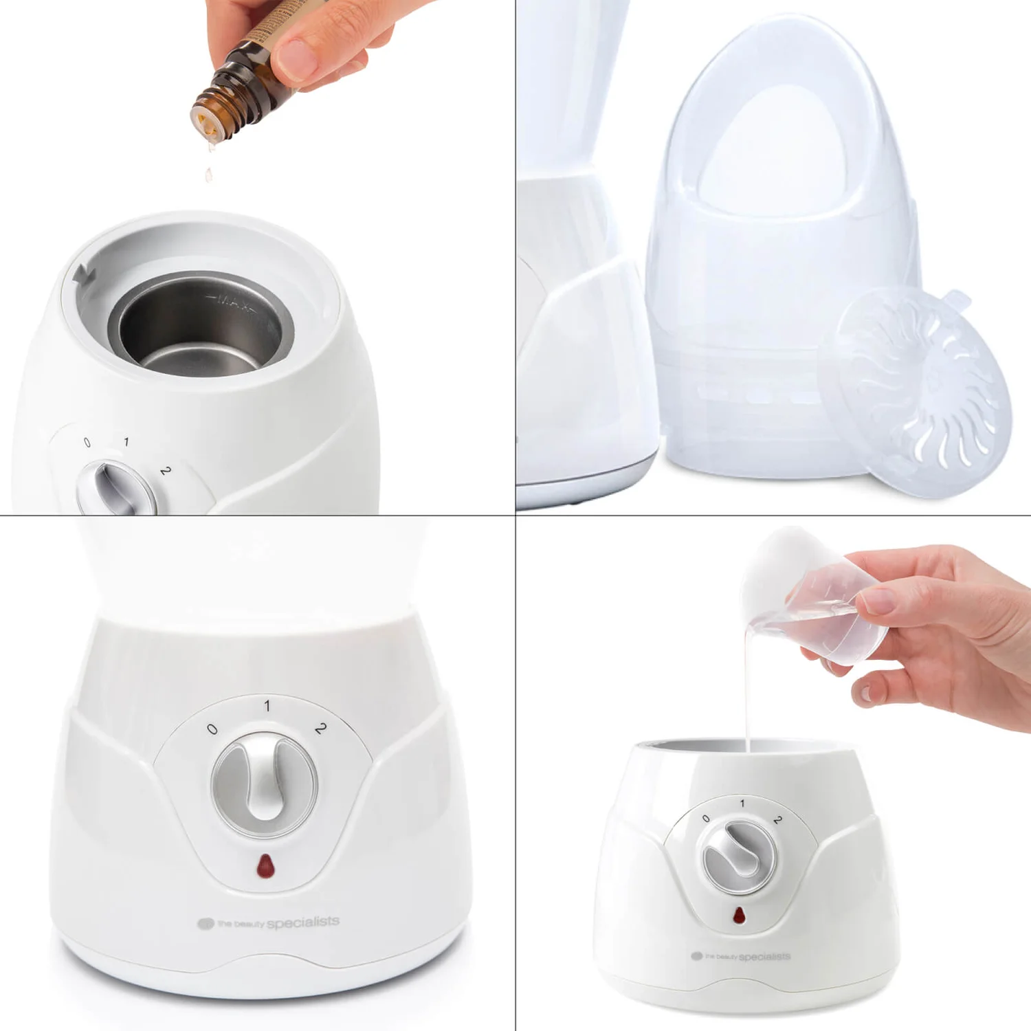 Kit includes measuring cup, essential oils vaporiser and steam inhaler attachment.